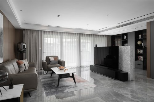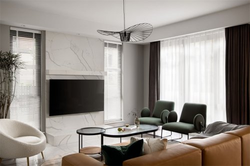 頂面運用的pu線條和燈盤裝飾,讓原本沉重的吊頂顯得輕盈精致。電視墻的大片留白讓空間更顯干凈清新,同時也方便投影,空閑時刻可以一起窩在沙發(fā)上看看電影。