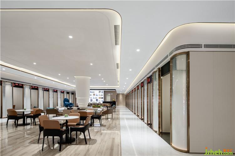 步入等候區(qū),裝修空間愈加朗闊。整個(gè)空間選用了木飾面、墻布、仿石磚、玻璃、不銹鋼這幾種最基本的材料,追求美感與質(zhì)樸的平衡。在整體對稱布局的基礎(chǔ)上,柱子處理雕塑化,減少體塊的笨重感。