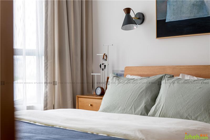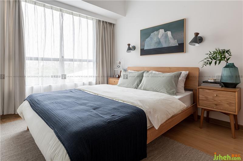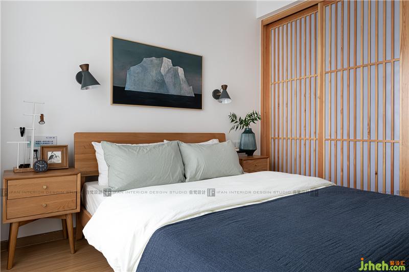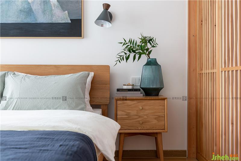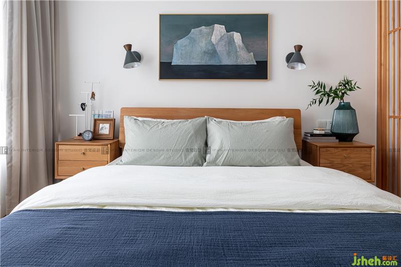 主臥延續(xù)了客廳的裝飾風格,室內(nèi)設(shè)計師白色和木色構(gòu)筑出足夠安靜的睡眠空間;深藍色的棉質(zhì)床品,時刻呵護著睡眠健康;簡約利落的線條元素打造極簡美學,如床頭的裝飾畫、柵欄推門、花瓶、床頭的首飾架等。