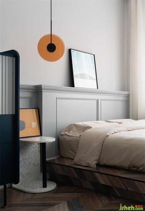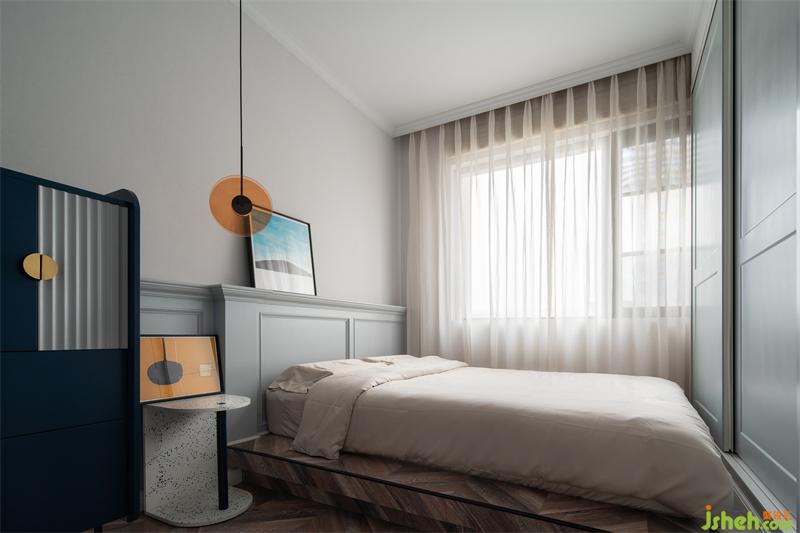 家居設計抬高了兒童房的方式來減少空間壓迫感增加舒適度,而藍色與橙色的色調無疑是為兒童房增添了一絲童趣。