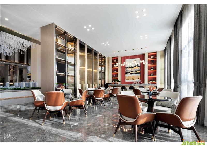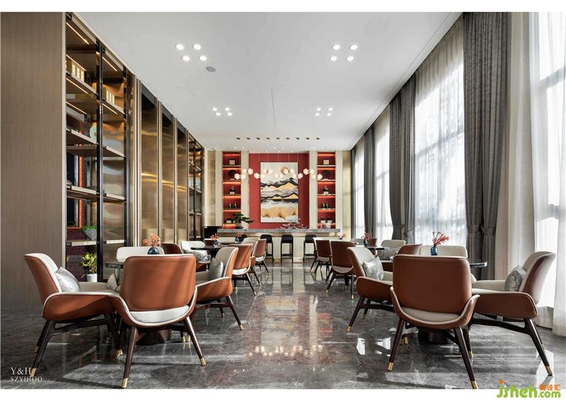 水吧區(qū)選用雅致的咖色皮革,讓空間暖而溫馨,墻面上的山水裝飾畫和吧臺上的藝術(shù)吊燈的曲線造型相映成趣, “山”“水”連綿渲染氛圍。