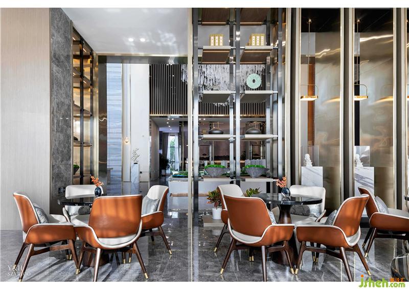 室內(nèi)空間令人舒適的暖灰色調(diào),金屬、水晶以及墻上切割的造型,透過隔斷墻隱約看到水吧洽談區(qū)的場景,讓這個平和而內(nèi)斂的空間豁然開朗。