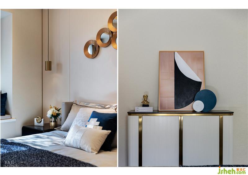 主臥摒棄繁復(fù)冗雜的擺設(shè),用簡潔明了的語言勾勒出生活的質(zhì)感,富有創(chuàng)造力的幾何掛畫增添空間的藝術(shù)內(nèi)涵。抱枕與地毯深淺不一的藍色,避免了色調(diào)的單一,使主臥空間層次感加強。