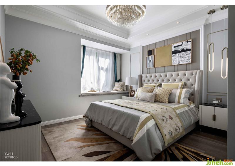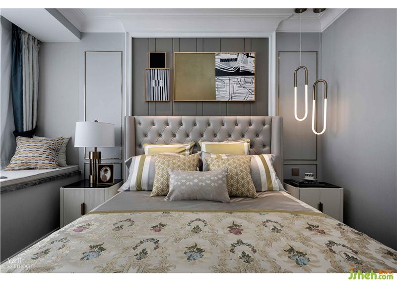 柔和的淺灰色給主臥營造了安寧溫馨的氛圍。床頭兩盞獨特輕奢的吊燈為沉穩(wěn)的空間增添了一絲趣味。