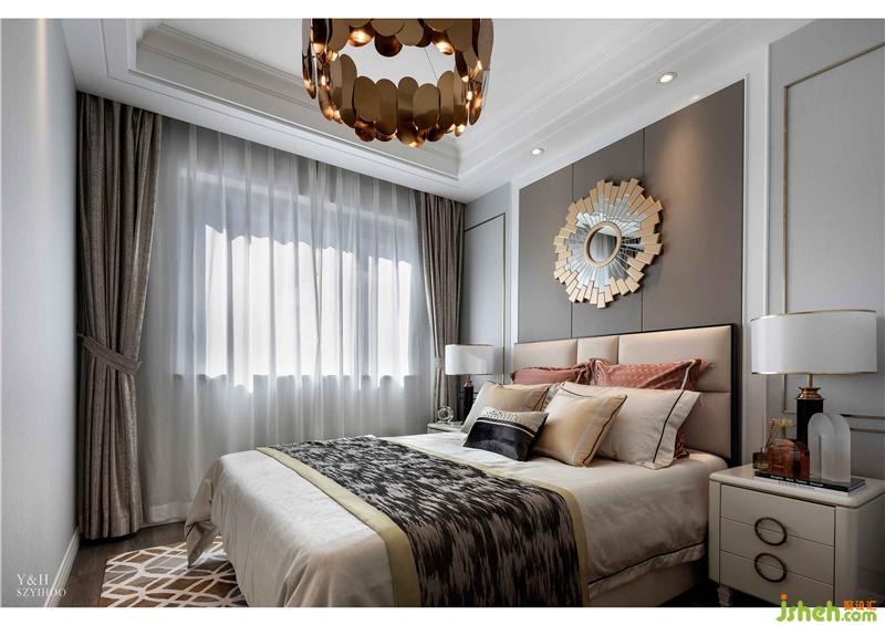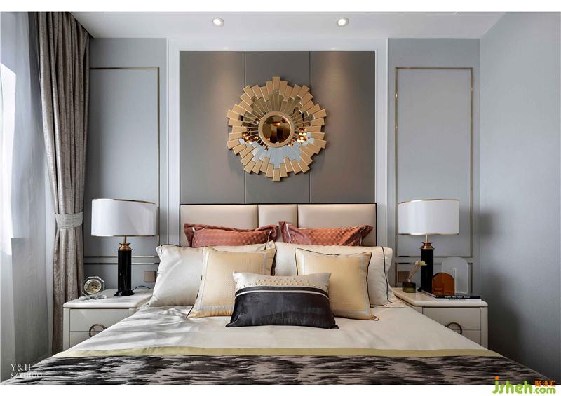 長(zhǎng)輩房中,米色系的床在灰白基調(diào)的場(chǎng)景中點(diǎn)綴橙色和黃色的暖色系抱枕,讓長(zhǎng)輩房舒適而不失復(fù)古的韻味。