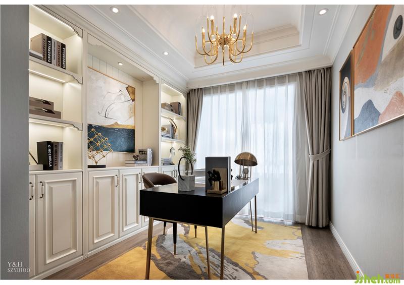 黑色的書桌配上白色的書柜,令書房穩(wěn)重大氣。精致的細(xì)節(jié)布置與金屬感十足的擺件為書房勾勒出別致一筆。