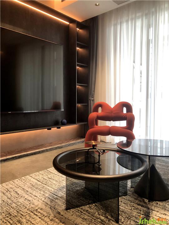 推拉門形成一個面,延長推拉門暗藏軌道做成燈帶形成線,線與面的結(jié)合,面于線上移動,同時在電視背景墻頂上設(shè)計一條平行燈帶形成兩條相互平行的長線,深圳家居設(shè)計既解決了照明問題,增加了空間的氛圍感,也讓整個空間多了一分張力。