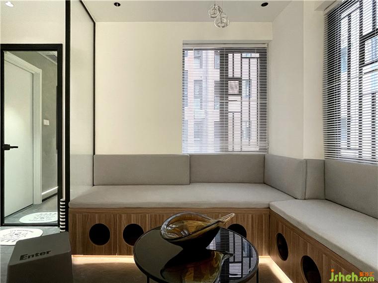 在過道口設(shè)計推拉門,當其打開時,客餐廳與內(nèi)部的臥室,多功能廳都是相互敞開的狀態(tài),展現(xiàn)了其的開放性,當其閉合時,各個空間又相互獨立,保證了私密性。