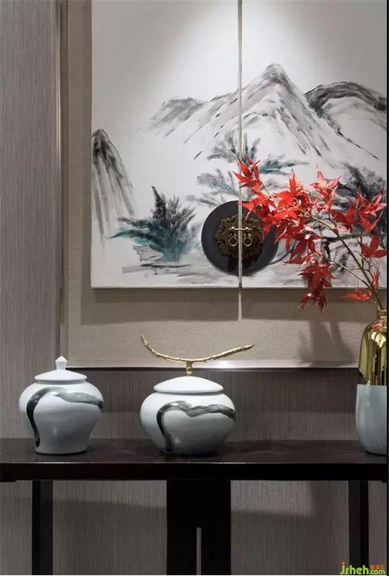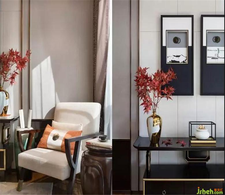 玄關,進出的必經之所。簡約的擺件、裝飾畫將中國文化講究意不直敘,情不表露的“含蓄”精神在一些細部上體現(xiàn)出來。而這,也正是樣板房想要呈現(xiàn)的——內斂大氣。