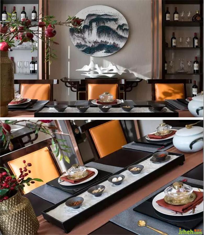 餐廳地面沿用富有水墨肌理感的銀灰色大理石,搭配深色的餐桌及餐椅,紅色的花藝點亮了整個空間,襯上一盞中式藝術吊燈,使其富有濃郁的東方內涵,卻又不失現(xiàn)代都市的生活方式。