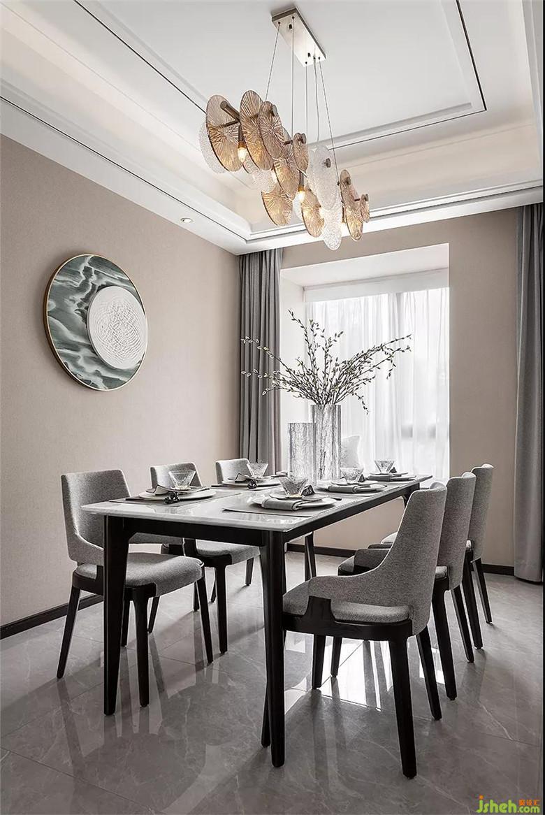 餐廳吊燈似竹筏小舟,引得池面波瀾交映,伴著翠影蘆葉,整個空間精致優(yōu)雅。