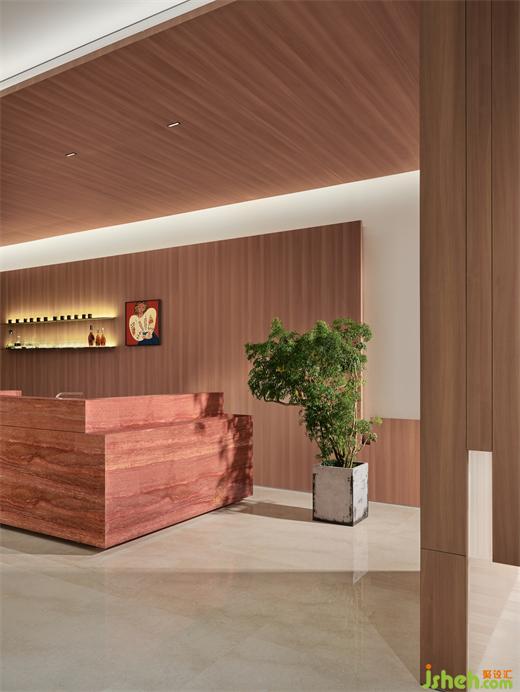 從門(mén)頭開(kāi)始,用通體的紅洞石搭建感官支點(diǎn),在造型上作內(nèi)倒、折疊處理,制造視線(xiàn)與動(dòng)線(xiàn)的轉(zhuǎn)折,長(zhǎng)道盡頭窺見(jiàn)前臺(tái)的“半身”,欲言而止且露高級(jí)。