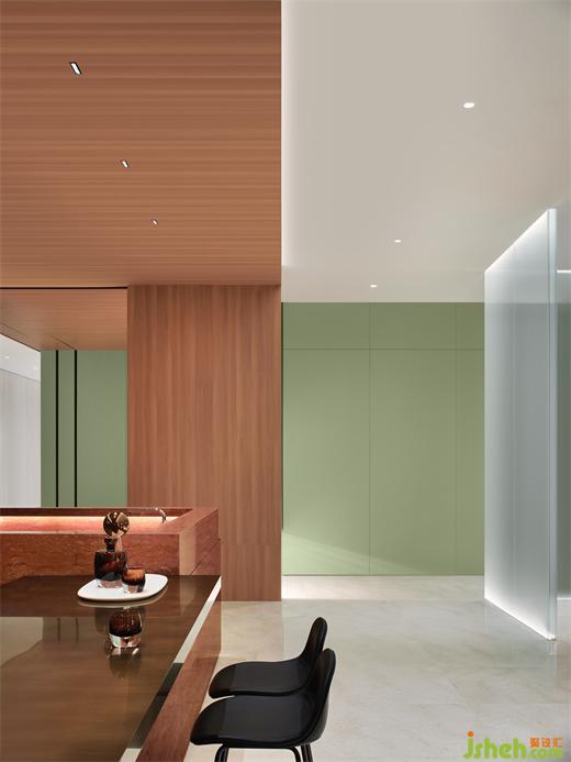 起伏流動(dòng)的公區(qū),與之相對(duì)的是一整片綿延的薄荷綠墻,輕薄地劃出開(kāi)放與私密邊界,門室隱入墻面,愈喚起向內(nèi)探索的興趣。