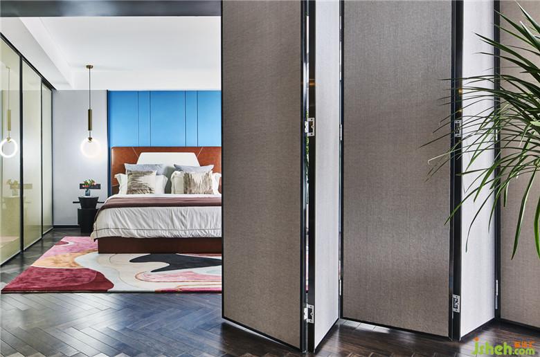 主臥床頭背景室內(nèi)設(shè)計(jì)師采用深藍(lán)色有助睡眠與休息,胡桃木色系的地板搭配讓空間更有質(zhì)感與穩(wěn)重