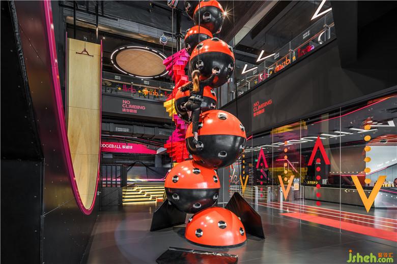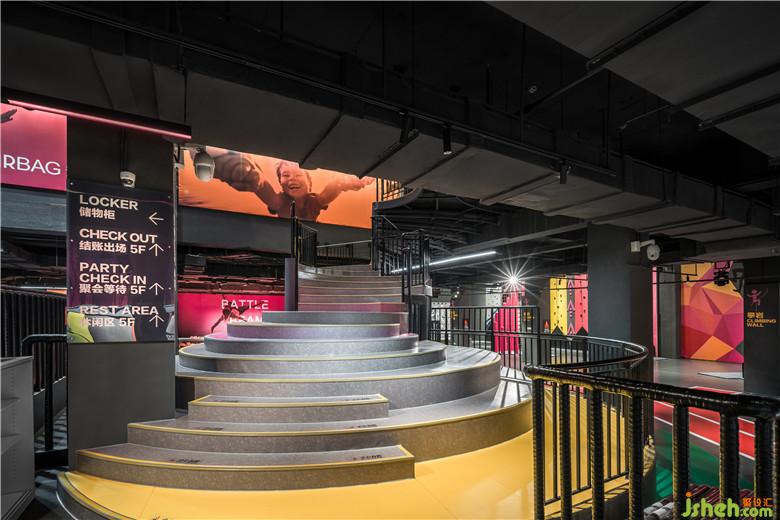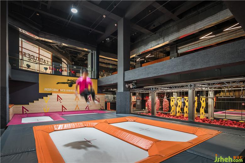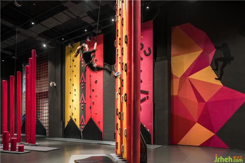 戶外的概念主題呈現(xiàn)在全民運(yùn)動(dòng)的休閑娛樂(lè)場(chǎng)所,室內(nèi)設(shè)計(jì)師將傳統(tǒng)印象中粗獷野性的極限運(yùn)動(dòng),轉(zhuǎn)變?yōu)榫屡c專業(yè)的運(yùn)動(dòng)體驗(yàn),山、水地形元素轉(zhuǎn)換成空間內(nèi)的硬件與情境。4F區(qū)域整合蹦床、滑索、攀巖各種戶外運(yùn)動(dòng),打造適合全民運(yùn)動(dòng)的品牌形象,透過(guò)品牌色彩結(jié)合燈光與視覺(jué)符號(hào),以更簡(jiǎn)單的線條、跑道與山陵形狀塑造室內(nèi)的動(dòng)態(tài)感,同時(shí)也兼具社交的功能。