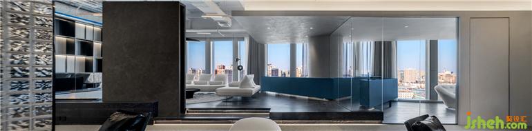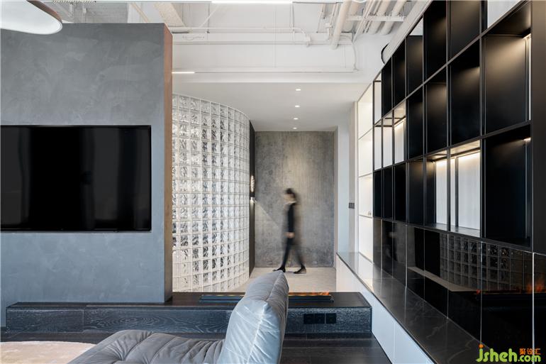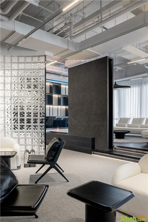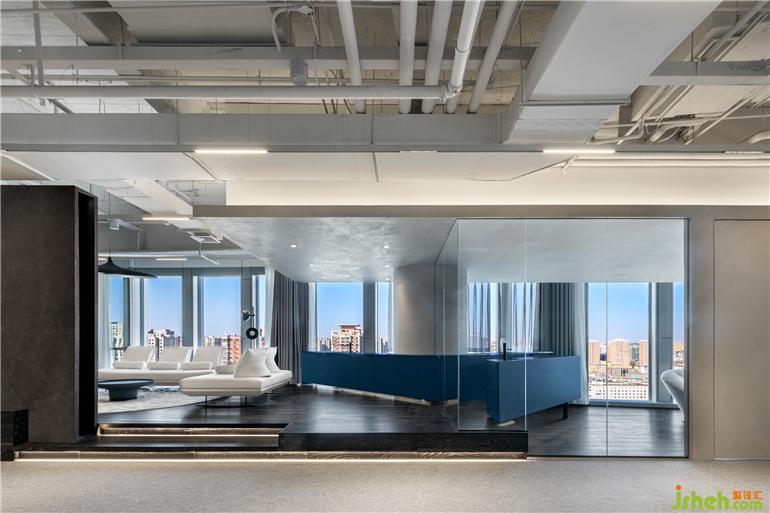 剛進入空間,視線從玻璃磚弧墻的側(cè)邊穿越而過,辦公室設(shè)計隱約可見寬敞的辦公室布局,左側(cè)為會客室與品酒區(qū),右側(cè)為書法茶室、主管辦公室、開放辦公區(qū)。會客室與品酒室以圓柱做為二區(qū)的分界,并規(guī)劃水吧區(qū)做為二區(qū)的緩轉(zhuǎn)處所,弱化圓柱突兀的沉重量體。我們以不對稱的天地結(jié)構(gòu)迭架出二區(qū)的空間框架,會客室的地坪架高,突顯該區(qū)的場域感,透過局部裸露的管線,營造出天花增高的視覺效果,空間的后半部則將天花局部封頂,延伸至整間品酒室,光滑平整的水平面,即是延伸,也是擴展。會客室與品酒區(qū)一高一低的結(jié)構(gòu)層次,以及水吧區(qū)的中繼轉(zhuǎn)換,共同賦予了空間比例上的安定與協(xié)調(diào),戶外遠(yuǎn)處景觀盡收眼底,結(jié)合工作與休閑感受。