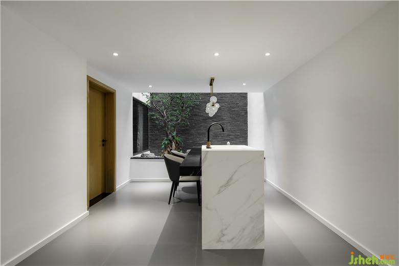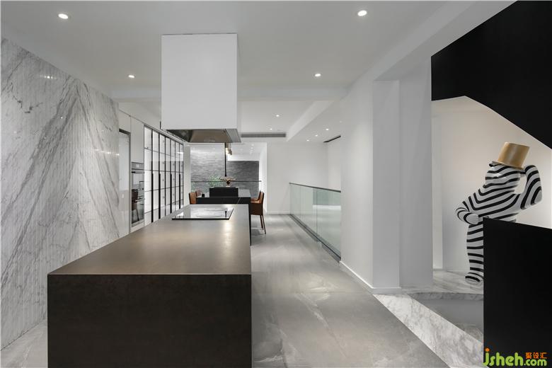 疊墅設計針對業(yè)主個性化精致化的生活方式,設計師對空間進行拆解、整合。拾級而下負一層,充滿藝術感與儀式感的精致廚房餐廳隨之而入,打造出空間場景更多的可能性。