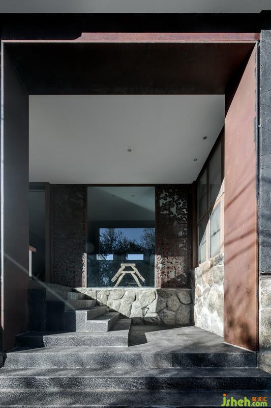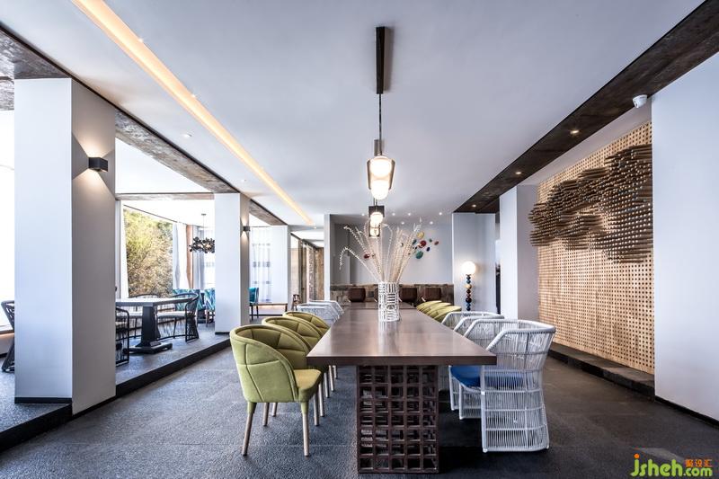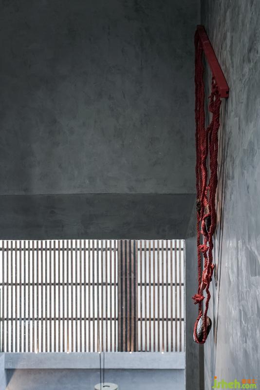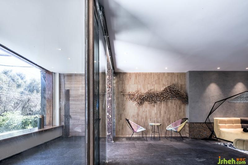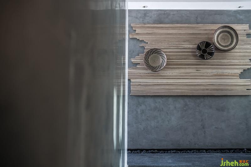 尹盛濤父親是木匠,他曾當過幾年的木工學徒,對木頭有著深厚的感情??蜅S昧舜罅康哪靖駯叛b飾墻面,可變換不同的造型。溫潤的木頭和裸水泥墻面、青石板地面碰撞,彰顯材質(zhì)本身的美感。