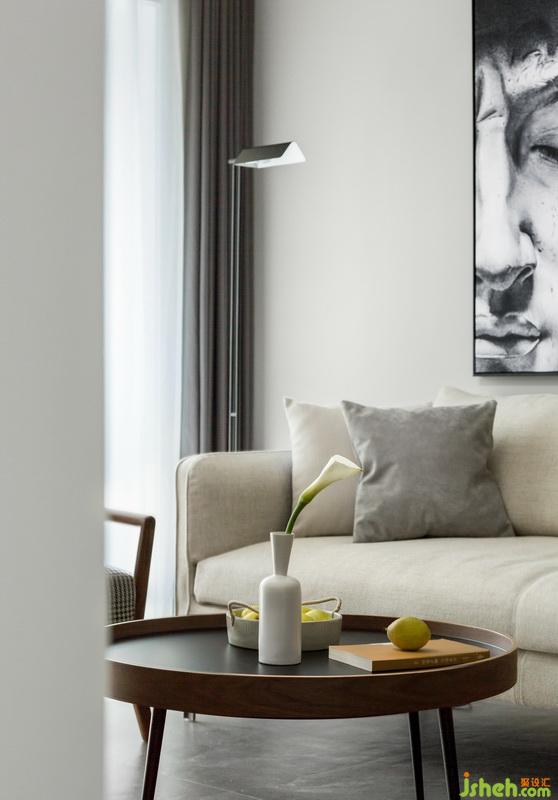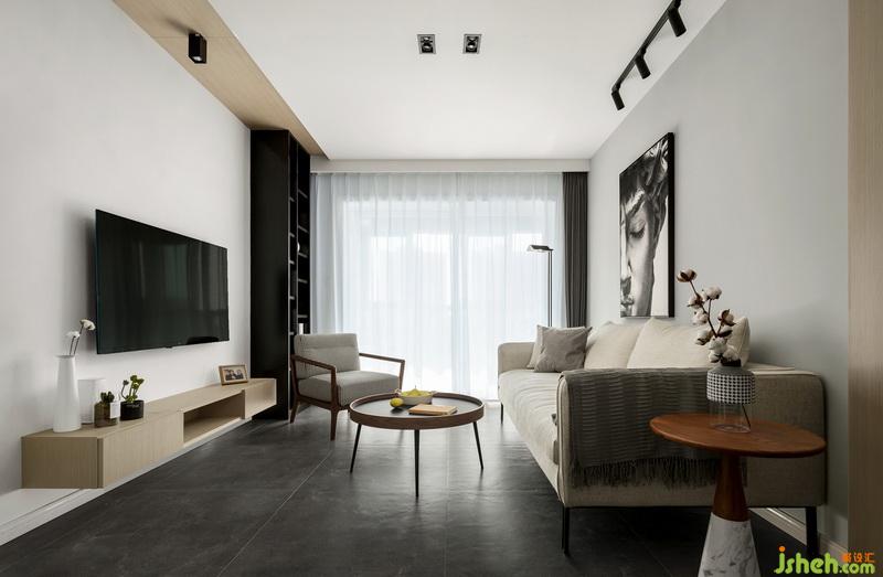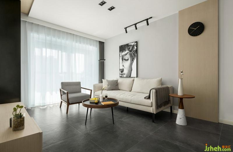 客廳吊頂拉平,無主燈。光源用落地?zé)簟⑸錈?、筒燈結(jié)合,局部分散照明可以讓空間更有層次感。地面深色調(diào),整個(gè)墻面空間都是大面積留白,局部搭配木飾面,想要表達(dá)的效果是、穩(wěn)、空、質(zhì)。布藝米白色沙發(fā)、灰色窗簾,線條落地?zé)?、個(gè)性掛畫、與空間里的木色元素搭配,讓硬朗與柔和的交融。
