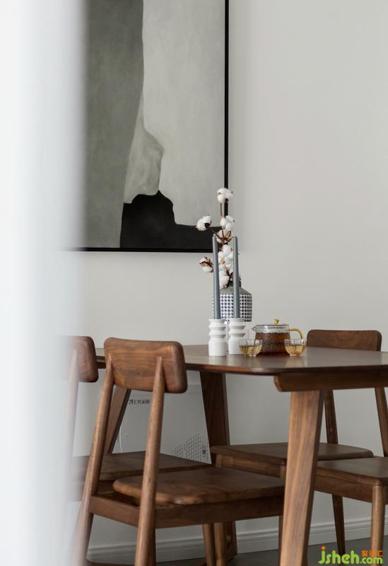 次臥硬裝整個空間以白和灰為主,怎樣讓整個空間更活潑一點呢?一副個性相錯的畫,一套粉白四件套就是點睛之處。在掛畫的時候,我們臨時根據(jù)現(xiàn)場調(diào)整掛畫方式,按照常規(guī)兩幅畫在一個水平線上,但是覺得過于刻板,調(diào)節(jié)后的畫面感覺更生動。