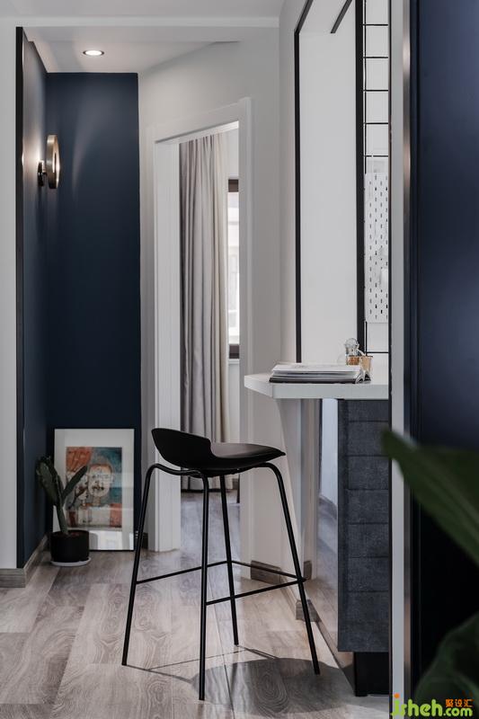隱與顯。書房采用半開放式設(shè)計,廚房為開放式廚房,空間的隱蔽與顯現(xiàn)結(jié)合。重點強調(diào)視覺和舒適度。書房的柜子也是嵌入墻體的設(shè)計方式,規(guī)整空間。
