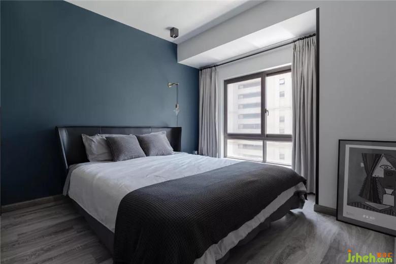 主臥床頭背景室內設計師選用深色藍配上皮質床,與人而言氣質是一種精氣神,對物而言看著就讓人心情愉悅而美好?!肚f子·盜跖》里就提出美麗的東西讓人身心舒暢,想要更好地生活,快樂地生活。所以我們需要讓自己更多的接觸美,讓自己更多的處在美的環(huán)境。