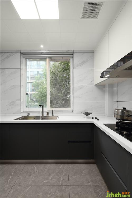 U型廚房,大理石紋路瓷磚搭配黑白櫥柜,質(zhì)感大氣。