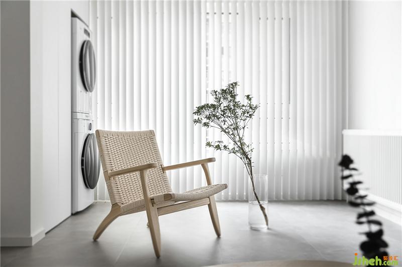 陽臺選用了木條紋百葉簾,葉片垂直疊加,明媚的日子,陽光透過空隙穿入室內(nèi),自成一道風景。