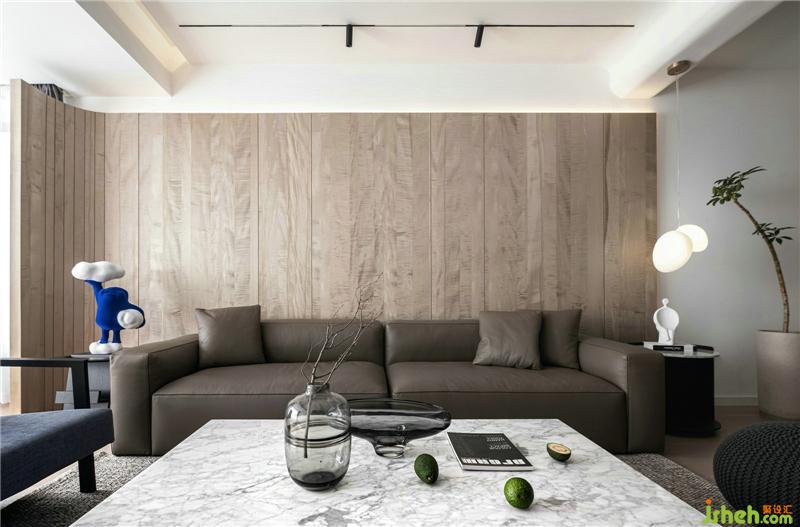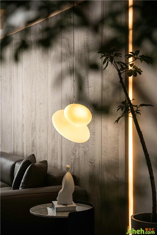 頂部是無主燈設(shè)計(jì)但留有一排射燈讓頂面更有層次立體感;梁結(jié)構(gòu)無法改變,所以做了弧度圓潤處理,提升美感。