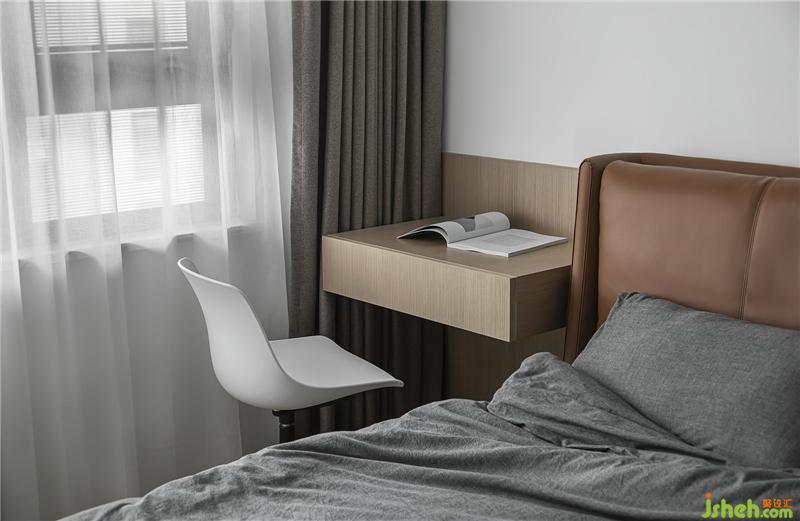 床尾采用了平板與柜體的交合處理的方式,增加臥室放置臺(tái)面,適宜的小景點(diǎn)綴,別具一格。