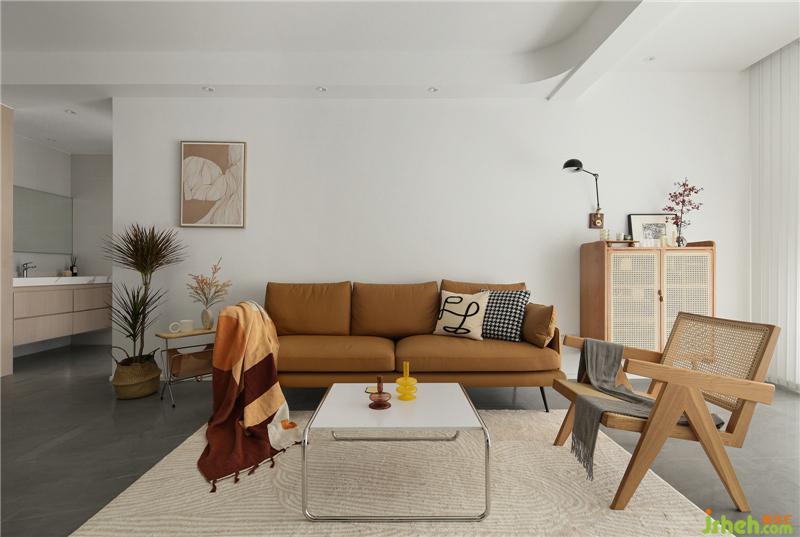 The background of the sofa is clean and simple, and the wood orange gives off a warm feeling.