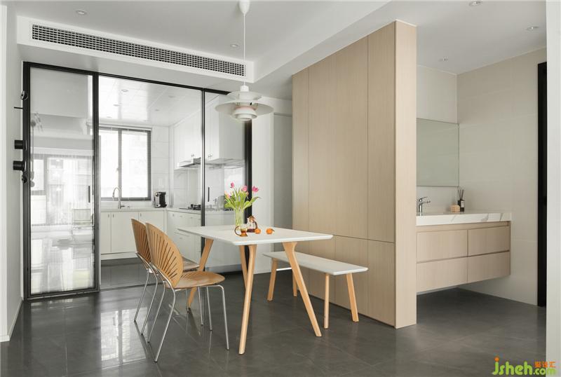 餐廳背景墻用木飾面裝飾,剛好與雙干區(qū)形成整體。南京室內(nèi)設(shè)計(jì)師廚房的玻璃移門(mén),劃分空間,讓空間通透。