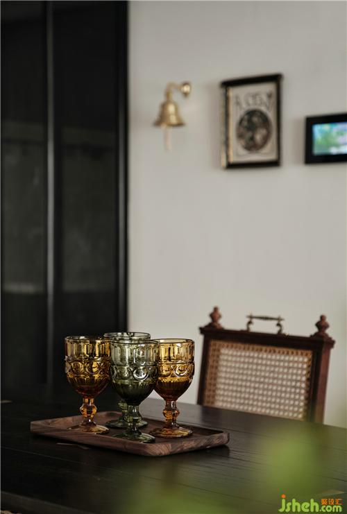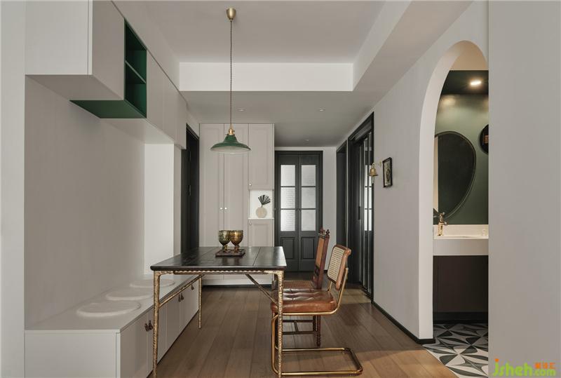 餐廳卡座上方的懸掛柜,特意留出一組開放式綠色柜南京裝修設(shè)計,綠色吊燈與之呼應(yīng),功能與裝飾并存。