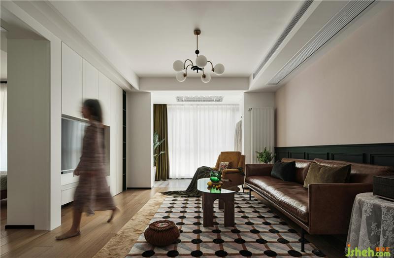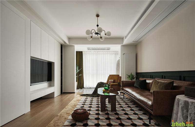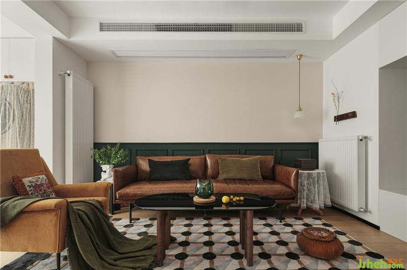 棕色皮質(zhì)沙發(fā),玻璃茶幾,帶有幾何元素的地毯,復(fù)古的味道油然而生,設(shè)計一個家,圓一個夢。