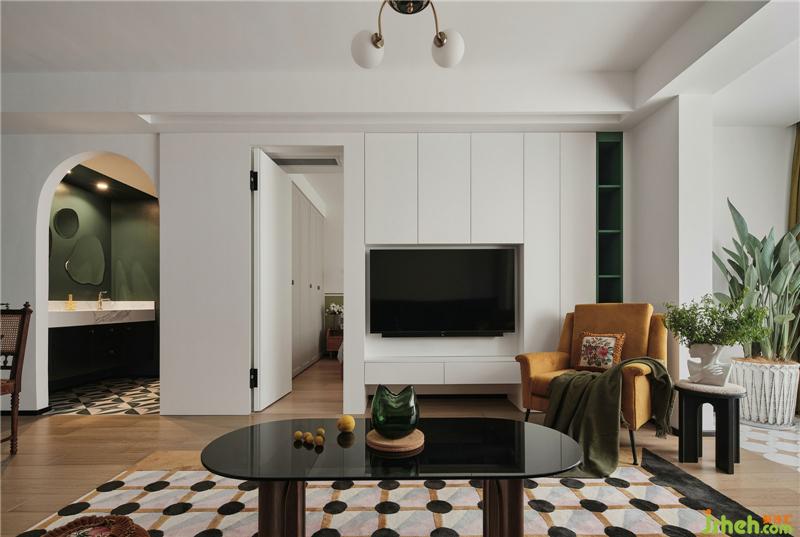 TV background wall, is through the living room and master bedroom wall knocked down, borrowed some master bedroom area to increase the living room storage, by changing the master bedroom access, also let the master bedroom storage space more.