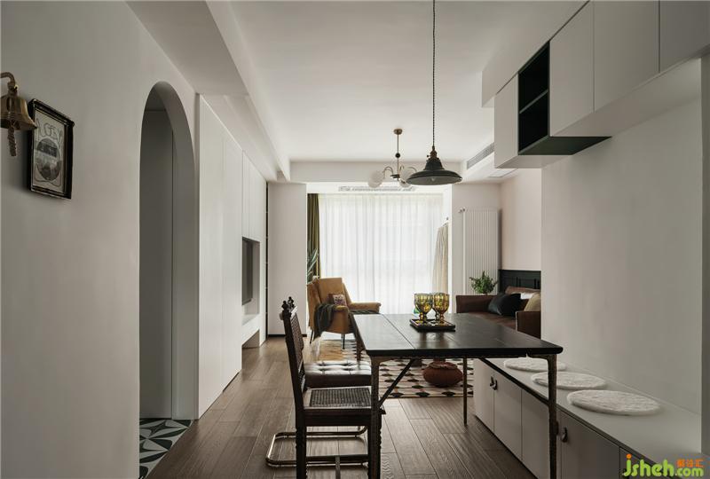 電視背景墻,是通過將客廳與主臥的墻體打掉,借用了一些主臥面積增加客廳儲物南京裝修設(shè)計,通過改變主臥進(jìn)入方式,也讓主臥的儲物空間變多。