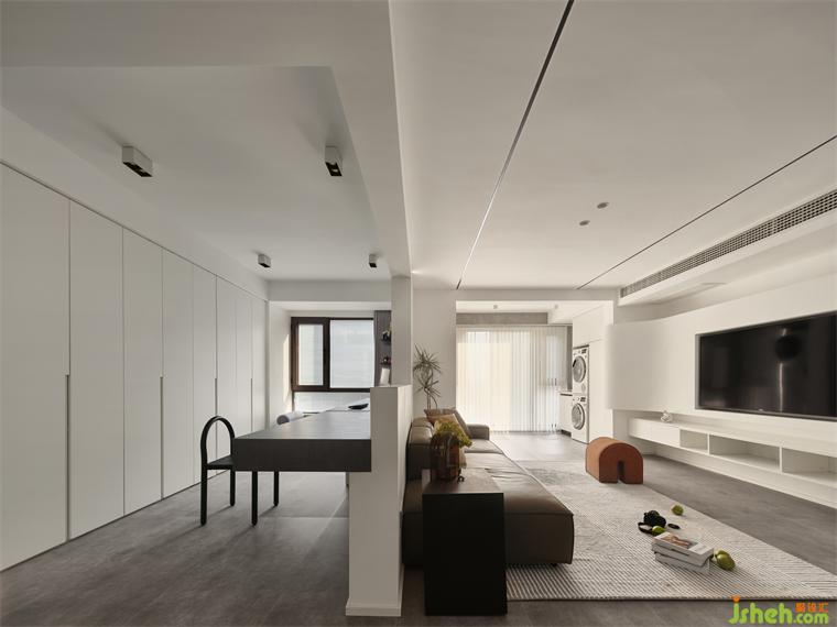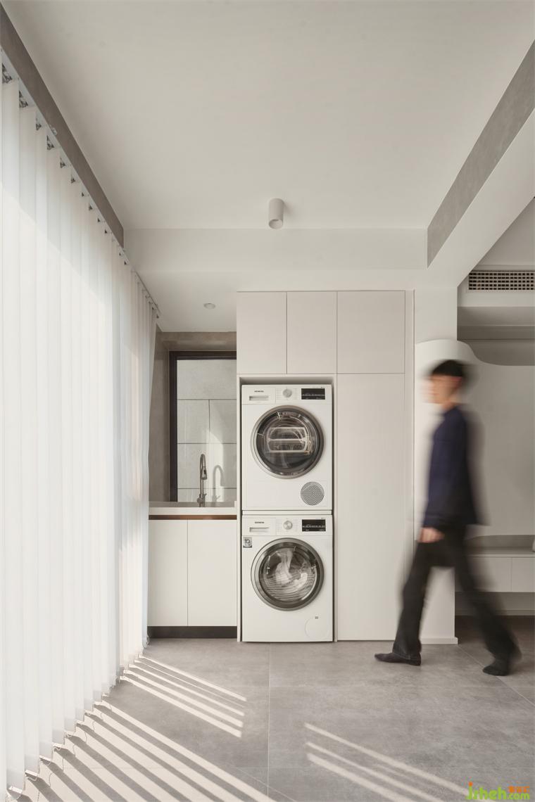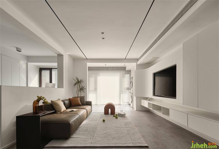 陽臺并入客廳,光影透過百葉簾折射出空間的光影,裝修設計自然而溫馨。陽臺柜嵌入洗衣機烘干機,日常必備家居小能手。