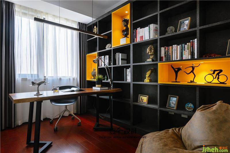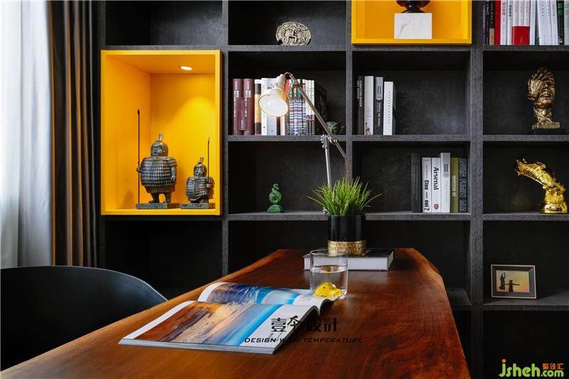 書房沒有用普通的書桌,取而代之的是貴人郎榻榻米提供的實(shí)木大板桌,營(yíng)造一種自然又質(zhì)樸的調(diào)性。整墻書柜采用水泥灰質(zhì)感的材質(zhì),局部嵌入明黃色的格子,兩種強(qiáng)烈對(duì)比的顏色層次分明,使得書柜穩(wěn)重又時(shí)尚,希望為書房空間帶來具有溫度的療愈氛圍。室內(nèi)設(shè)計(jì)師