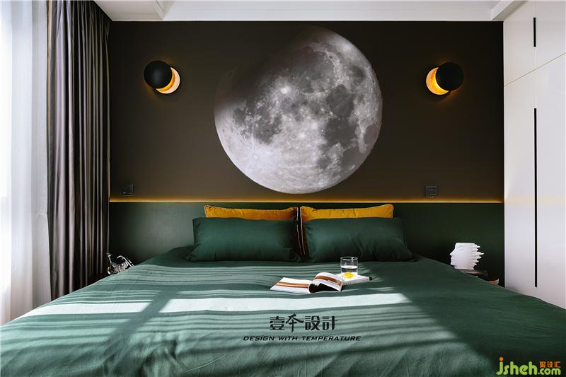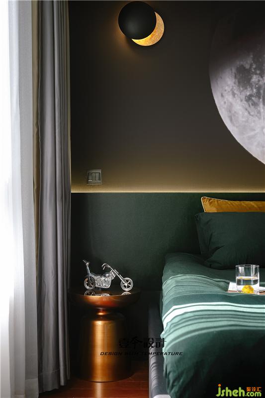 沒錯(cuò),黑色墻紙正是大家熟知的月球圖案,周導(dǎo)本身既是影視從業(yè)者也是電影發(fā)燒友,設(shè)計(jì)階段恰逢電影《流浪地球》的上映,我們一拍即合,當(dāng)即決定采用太空題材的元素來打造主臥風(fēng)格。床頭背景墻選用了這一款月球壁紙圖案,壁紙的下面是綠色的皮質(zhì)護(hù)墻板,護(hù)墻板內(nèi)暗藏?zé)魩У墓饩€猶如從飛船舷窗內(nèi)望向深邃的太空。墻上的壁燈就好像宇宙中漂浮的星球,加上中間的飛碟主燈,一起散發(fā)出柔和的光線,造型溫情而浪漫。室內(nèi)設(shè)計(jì)師