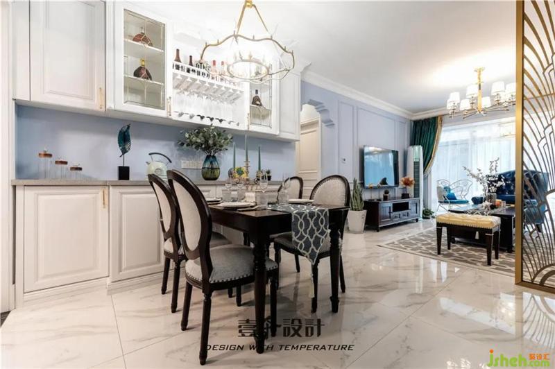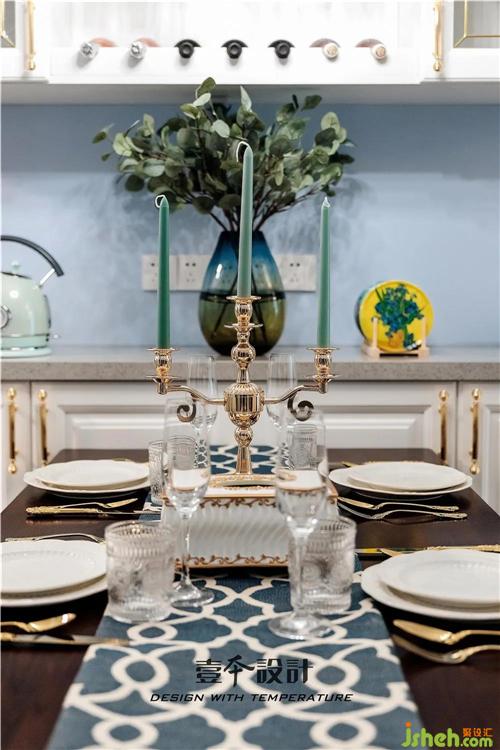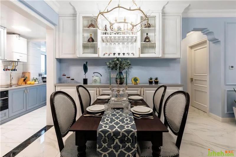 藍(lán)色浪漫一直延續(xù),沉穩(wěn)的木質(zhì)餐桌椅與華麗的水晶吊燈結(jié)合,精致又大方。餐桌旁邊的吊柜和儲物柜,滿足了收納和展示的需求。金色的餐具優(yōu)雅高端,散發(fā)著滿滿的輕奢氣息。