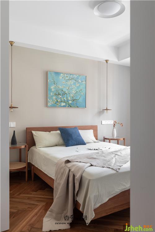 主臥藍(lán)色背景和黃色抱枕的結(jié)合,使空間看起來不枯燥,能夠感受到活潑新鮮感。牛皮靠背的真皮床,簡約中融合了品質(zhì)、藝術(shù)與功能實(shí)用。衣柜旁還有一處休閑區(qū),休閑舒適的氛圍不失空間的功能性與沉穩(wěn)感,光影交錯,在飄窗上灑下一米陽光。
