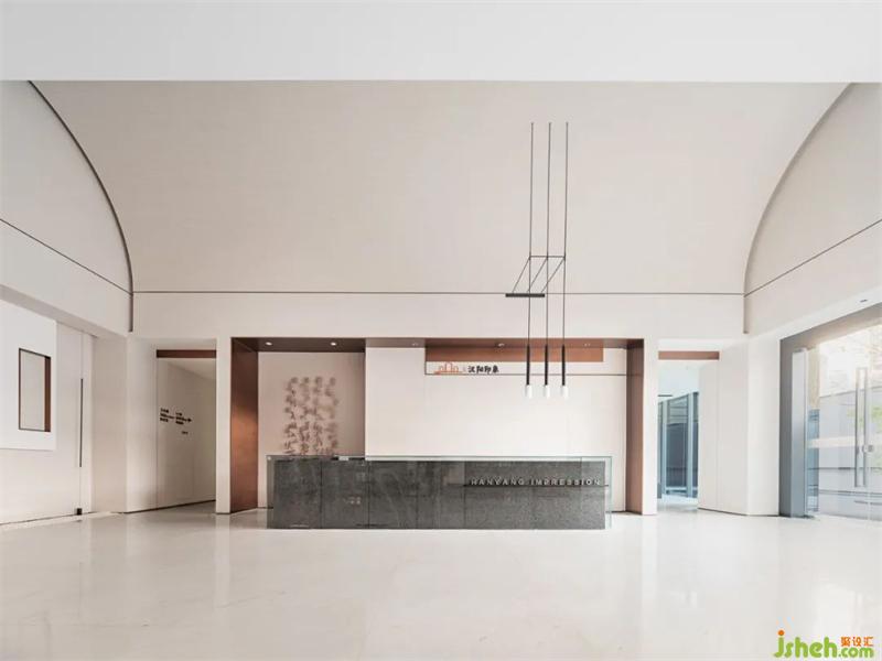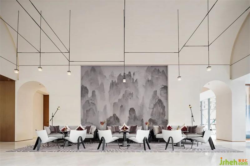 延續(xù)線條的質(zhì)感,背景輔以大型水墨畫的柔和,傳統(tǒng)與現(xiàn)代結(jié)合。重巒疊嶂,云霧繚繞,讓人們回歸自然,感受漢陽的山水之趣。