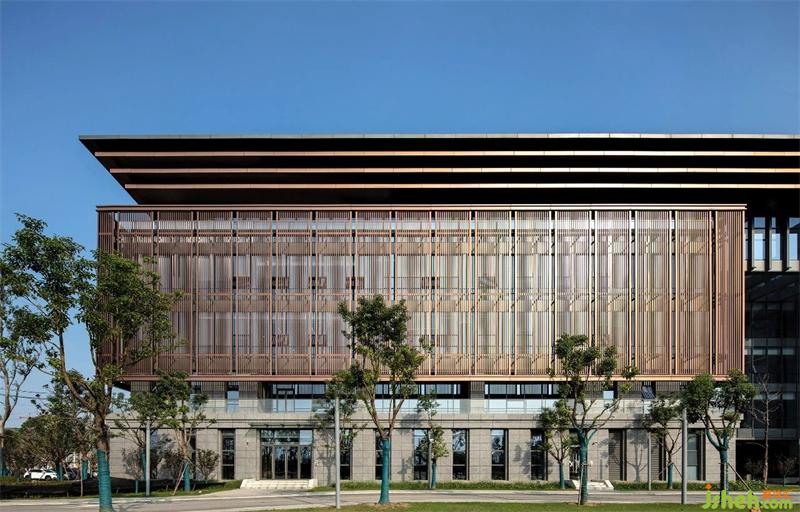 建筑外立面是豎向排布的金屬線條,具有挺拔、高聳、向上的視覺感受,無形之中自有一種濃郁的韻律感,像一串優(yōu)美的音符。