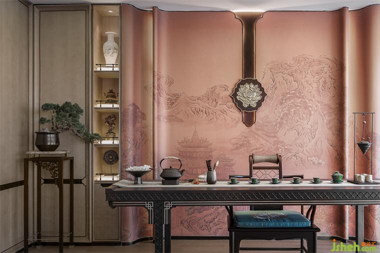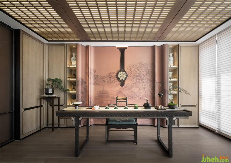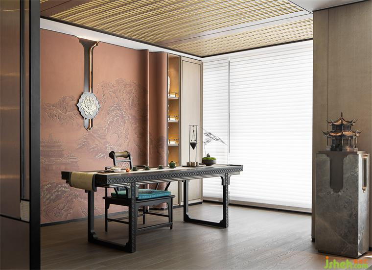 茶室空間以暖咖色與具有東方貴氣感的琥珀色為主色調(diào),樣板房設(shè)計營造一種穩(wěn)重悠然的中式氛圍。夾絲玻璃墻體與木格柵發(fā)光天花將自然光引入室內(nèi),通透而舒展。