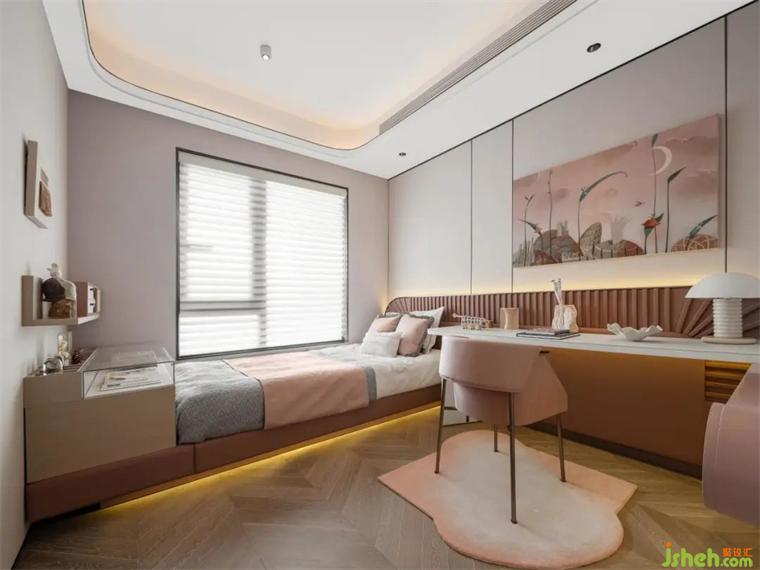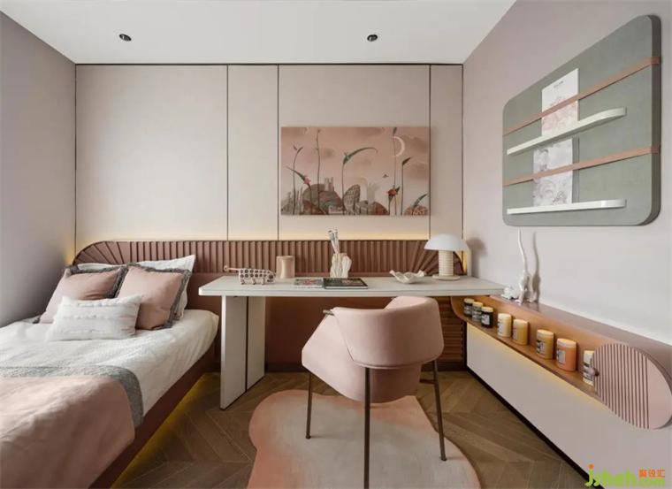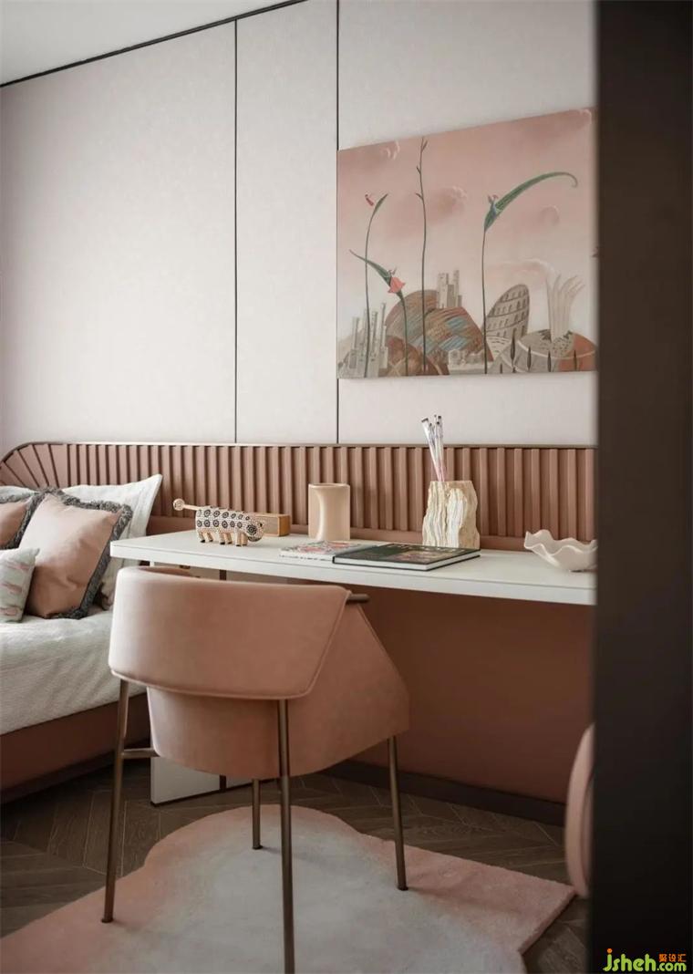 座椅下的不規(guī)則小毯,添了點(diǎn)小女生獨(dú)有的俏皮可愛。樣板房設(shè)計(jì)桌面上不同尋常的幾何造型擺件與極具想象力的掛畫,增添奇思妙想的夢幻氛圍。
