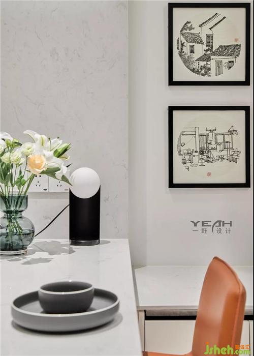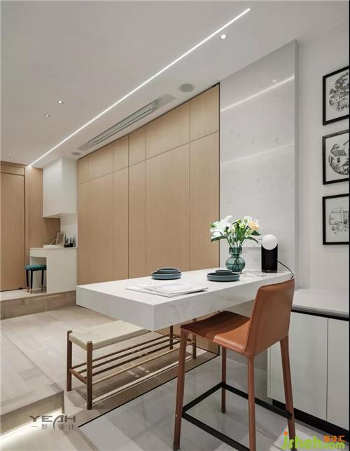 餐廳的設計上我們采用的是石材,從餐桌一直延伸到臺面高低錯落滿足大人和小朋友同時就餐。同時地面,墻面,頂面 我們?nèi)坎捎冒咨浜蠠艄庠O計提亮整個室內(nèi)設計師空間。