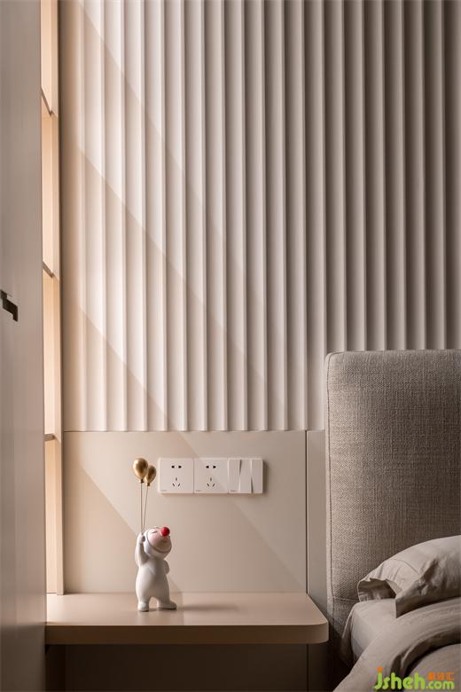 造型的極致簡單化,讓質(zhì)感成為空間的主角。木格柵與布藝的肌理細(xì)膩而不乏質(zhì)感,傳達(dá)內(nèi)在的精致感;奶白的色調(diào)在空間鋪陳出滿室的溫柔優(yōu)雅,與材質(zhì)的溫潤舒適相得益彰。開放格賦予燈光形狀,光線深淺不一,形狀各有不同,奇妙的光之語言刻畫獨(dú)特而又自然的美。