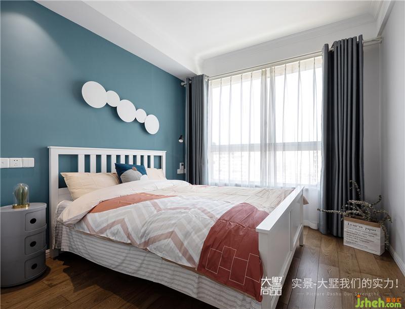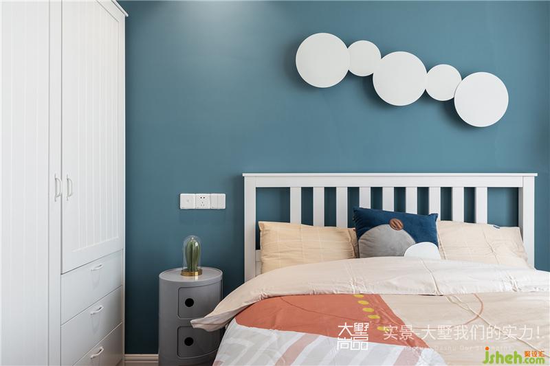 藍色背景墻在大面積白色中已然占據(jù)最醒目的焦點位置,圓形裝飾品讓空間看起來更加具有活潑特點常州室內(nèi)設計師。