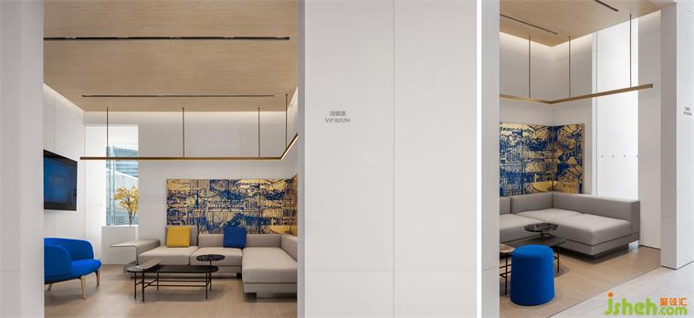 As one enters the user area, the space atmosphere gradually shifts to a warmer tone. The balance between the wood and blue elements is achieved subtly throughout the space.