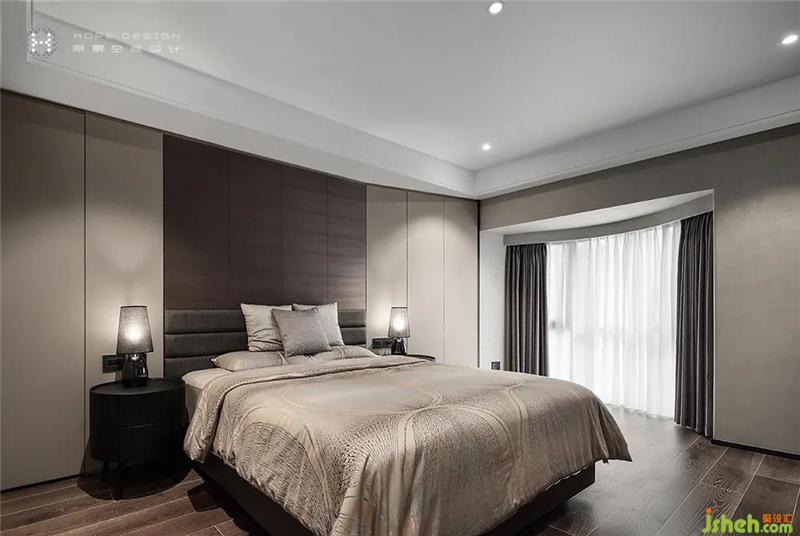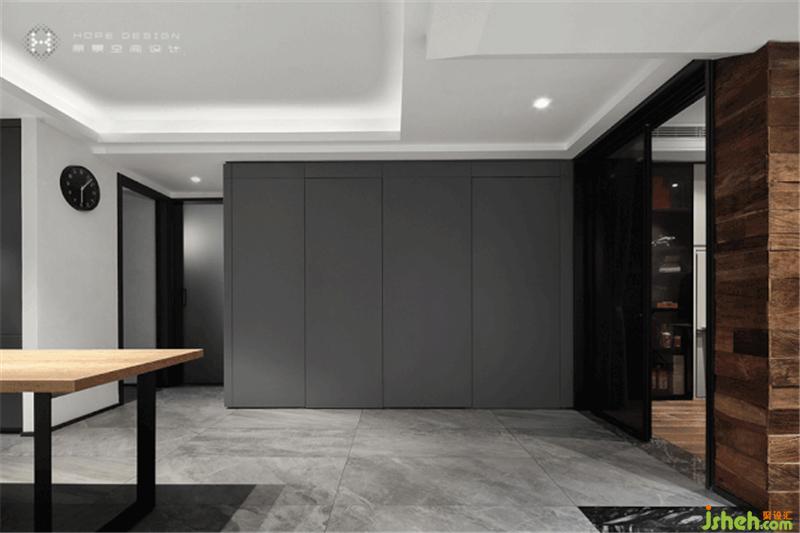 設(shè)計師將原本不規(guī)則的墻體進行改造,增加了收納儲物空間。并把儲物間和主臥的門藏于墻體內(nèi),墻面規(guī)則的分塊設(shè)計成為裝飾,整體性達到統(tǒng)一。
